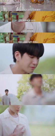 这一段还有个很巧妙的设计是,没有放出后续夜聊说的话,借着BGM的歌词,把两个人的命运感描述出来ㅠㅠ慢慢靠在一起坐着,就是慢慢靠近的两颗心🥲 第三次推进是大师讲了两个人是「劫数很重的命定之人」,In愿意帮Thap是真心的,希望两个人能在面对这些阻难的时候,更加沉稳些。听完大师的话,Thap看到在父母灵位前哭泣的In,紧皱的眉头和慢慢抚上心口的手..「爱一个人从心疼开始」💓