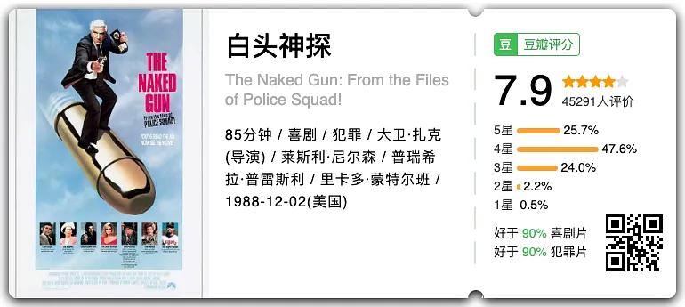 莱斯利·尼尔森(Leslie Nielsen)扮演的白头神探弗兰克·德雷宾一边办案,一边出糗,是很多人的童年回忆。